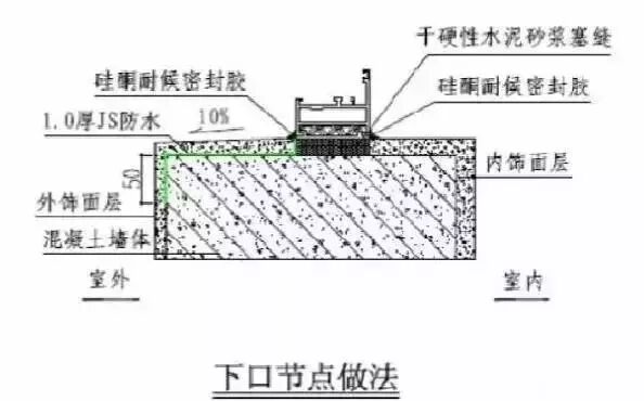 2. 窗下框未设置泄水孔或泄水缺口,使底框长期积水而造成窗台渗水;
