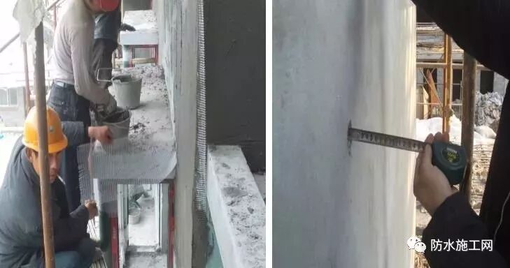 检查:通过跟踪检查,过程控制,工艺上都能达到两次成型,先粉刷5mm厚,进行贴网,网贴好后,再粉3mm厚。墙面粉好后,进行墙面破坏抽查,抽查部位有90%网格布控制在抗裂砂浆层内3-4mm。