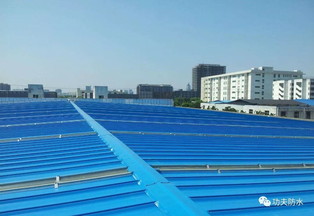 此项目选用凯阳铝面防水丁基胶带维修彩钢屋面,防水效果非常好,满粘施工隔绝了彩钢板和空气、水、阳光的直接接触,反光的表面一定程度降低夏季工厂的温度。